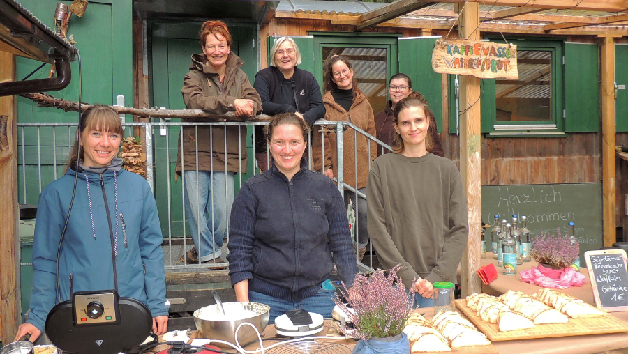 Auf dem Foto hinten, Team des Kiga Waldpilz: Janina Förster, Silvia Stockschläder, Friederike Edelmann und Carolin Schröder, vorne sind die Eltern und Unterstützerinnen: Babett Erner, Sarah Lange und Claire Uhlig.