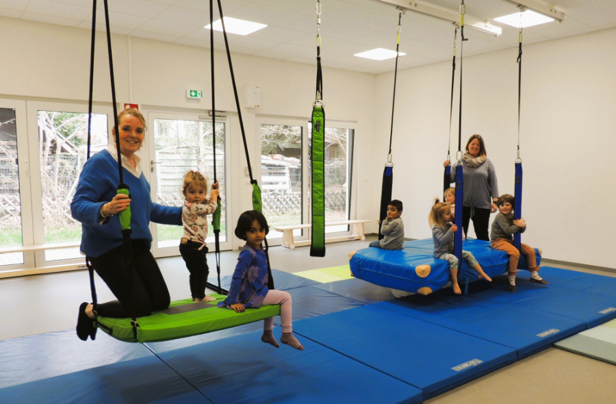 Die Nutzung des Bewegungsraums mit den flexiblen Elementen ist weit mehr als Toben. Iris Birlenbach: „Wir sehen fast täglich, wie einige Kinder mutiger werden und diesen neuen Freiraum für sich entdecken. Schaukeln fördert nicht nur das Körperempfinden und das Zutrauen, sondern auch, dass Miteinander. Denn es müssen Regeln eingehalten werden und man muss ich miteinander verständigen, achtsam sein, das geht über Sprachgrenzen hinweg.“ Andrea Biro, selbst Mutter von zwei Kindern, ergänzt: „Schaukeln ist ein so elementares Erlebnis! Bevor das Kind zur Welt kommt, erlebt es das Getragensein, dann später das Wiegen auf dem Arm. Schaukeln kann energetisch aufladen und auf der anderen Seite für innere Ruhe und Entspannung sorgen.“