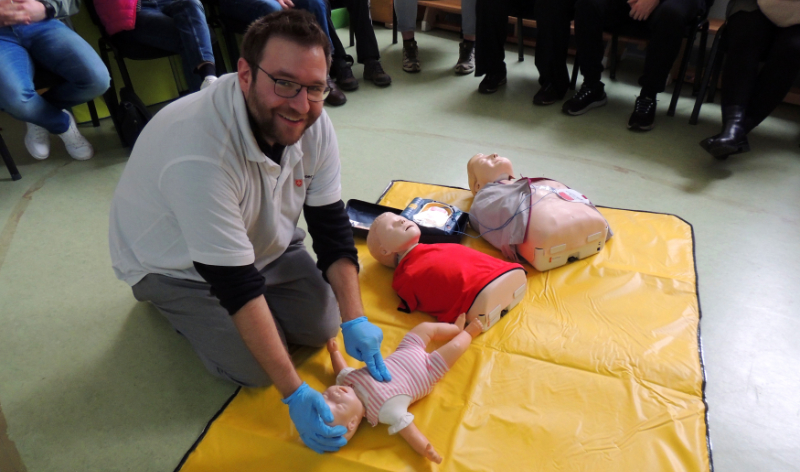 Auf mögliche Vorkenntnisse eingehend, erläuterte Nico Steffenhagen auch die Ähnlichkeiten zwischen Druckpunkt, Beatmung und Herzmassage bei Erwachsenen und machte die Unterschiede sehr deutlich, die bei Kindern und Säuglingen aufgrund deren Entwicklungsstand unbedingt zu beachten sind. Gleichzeitig räumte der erfahrene Ersthelfer mit hartnäckigen Halbwahrheiten auf, wie beispielsweise zur Notwendigkeit der Beatmung. Nico Steffenhagen: „Bei einem Kind ist die Beatmung unverzichtbar, denn sie vergessen auch schon mal zu atmen, es ist noch nicht so automatisiert wie bei uns.“ In der Gruppe wurde genickt und sich daran erinnert, dass sich Kinder schon mal richtig in Rage schreien können, ohne erkennbar Luft zu holen. Die Teilnehmenden lernten, was sie wann und wie bei Säuglingen, Stichwort „Schnüffelposition“, und Kindern als erstes zu tun haben und konnten Beatmen und Herzmassage an den Puppen ausprobieren, um ein Gefühl dafür zu entwickeln.