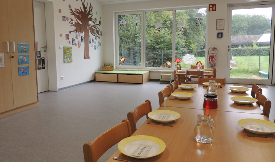 In Anlehnung an die Pädagogik von Maria Montessori und Emmi Pikler werden die Wiesenhüpfer (0-2 Jahre), Waldentdecker (2-6 Jahre) und Bergriesen (3 - 6 Jahre) betreut. Die Kita-Gestaltung wirkt sich positiv auf die teiloffene und damit gruppenübergreifende Arbeit aus. Bewegungsraum, Bauraum oder auch das Frühstückscafé unterstützen die partizipative Arbeit mit den Kindern – oder wie gesagt: „dass wir zusammen sind“. Innerhalb des Konzepts wird auch Mitbestimmung und Demokratie geübt.