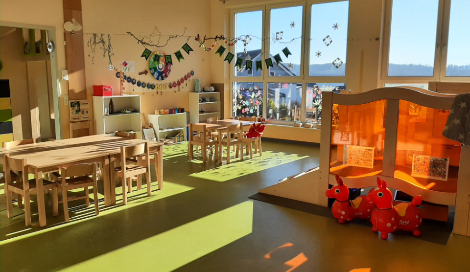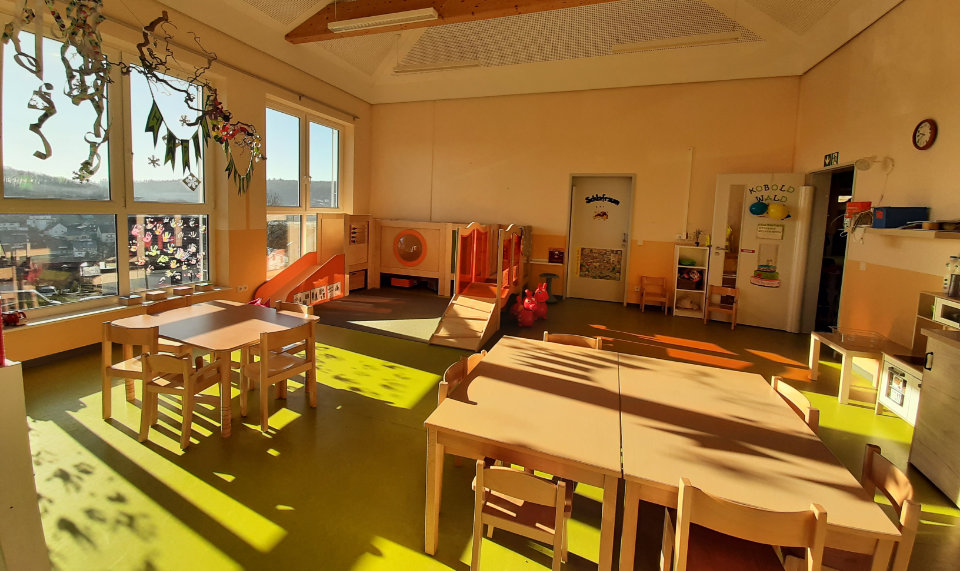 In dem dreigliedrigen und zweistöckigen Gebäude, mit hohen Decken im Obergeschoss und einem großen Bewegungsraum, können sich in drei Gruppen Kinder von 4 Monaten bis zum Schuleintrittsalter im Koboldwald, Wichtelnest und der Räuberhöhle wohlfühlen und entfalten.